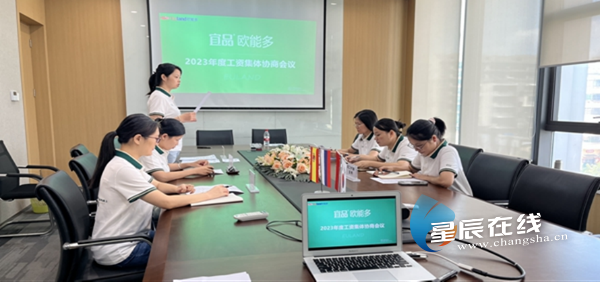 (湖南欧能多乳业有限公司2023年工资集体协商现场。)