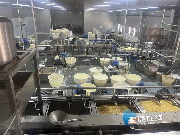 浸泡黄豆、磨豆滤浆、铁锅煮浆、石膏点浆……在湘东情现代化生产厂房内,每天有10余吨大豆标准化地被制作成攸县豆腐、攸县香干等豆制品,运往全国各地。