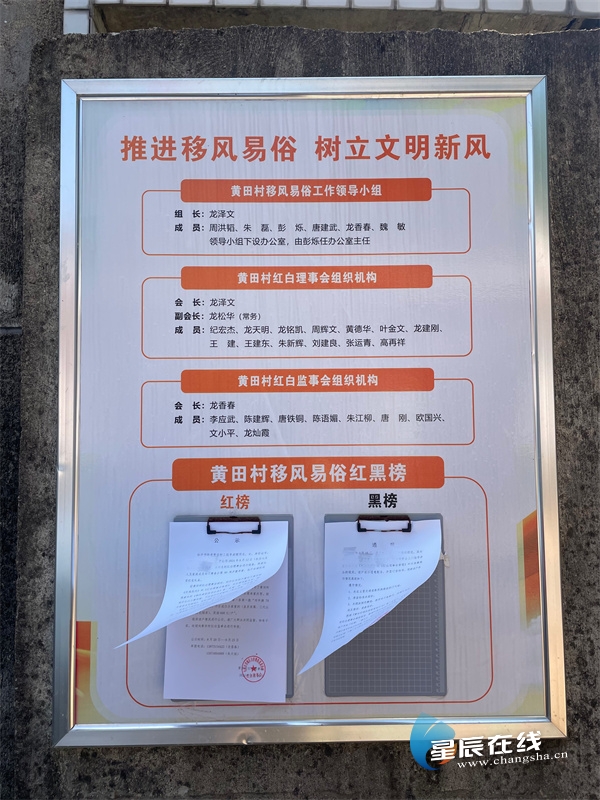 在望城区白沙洲街道黄田村村民委员会的公示墙上,“推进移风易俗,树立文明新风”一栏,黄田村移风易俗红黑榜张贴着最新处理结果,对2024年在移风易俗做得好的村民进行公示表扬,反之则通报批评。