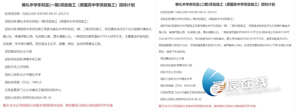 雅礼中学东校区项目已完成方案设计,正紧锣密鼓推进建设,其中东校区一期、二期工程均已完成招标计划挂网,一期的项目施工招标公告也于7月30日正式挂网,预计2025年秋季建成开学。