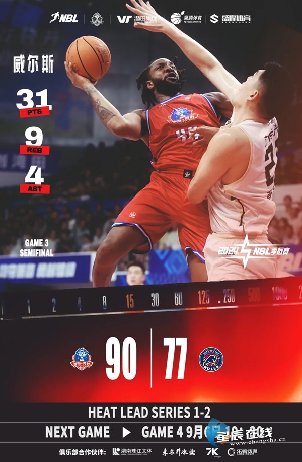 星辰在线9月5日讯(星辰全媒体记者 贺亚玲)9月4日19:30,2024全国男子篮球联赛半决赛决赛第三轮继续进行,长沙湾田勇胜主场迎战香港金牛。本场比赛,回到主场的勇胜,在全场球迷的加油助威下,持续稳扎稳打,最终,长沙湾田勇胜90:77香港金牛,半决赛大比分来到1:2,系列赛也进入第四场。