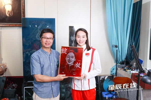 (湖南省非物质文化遗产“宝庆瓷刻”的代表性传承人、湖南省工艺美术大师刘金铎向奥运冠军张雅怡赠送专门制作的玻璃锤画肖像。)