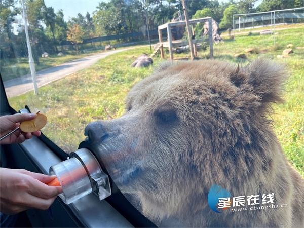 (长沙生态动物园“限时限量”推出猛兽投喂车项目,游客可乘坐观光车深入猛兽区,投喂老虎、棕熊等动物。)