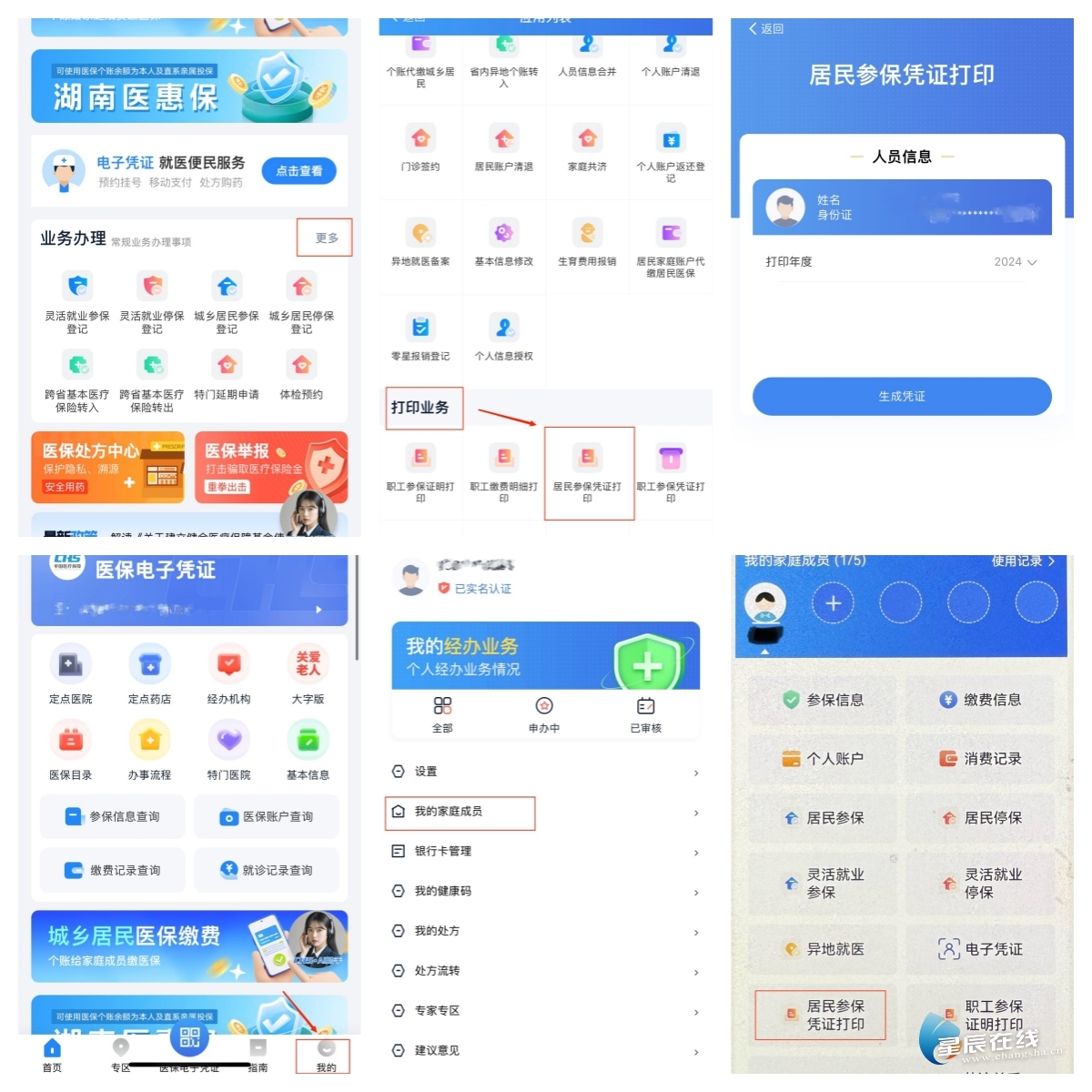 如果您是被代缴人本人登录,则点击“业务办理”板块右侧的“更多”,然后点击“打印业务”的“居民参保凭证打印”,选择“打印年度”,再点击“生成凭证”并下载。