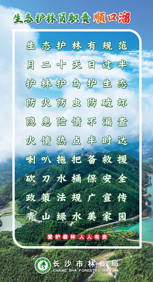 顺口溜具体内容为:生态护林有规范,月二十天日过半;护林护鸟护生态,防火防虫防破坏;隐患险情不漏查,火情热点半时达;喇叭拖把备救援,砍刀水桶保安全;政策法规广宣传,青山绿水美家园。