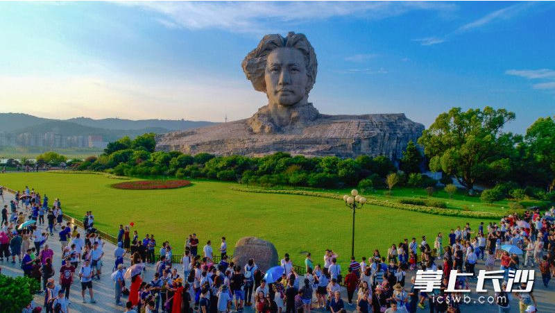 长沙市是底蕴深厚的文化名城,游客们正在橘子洲头拍照打卡。