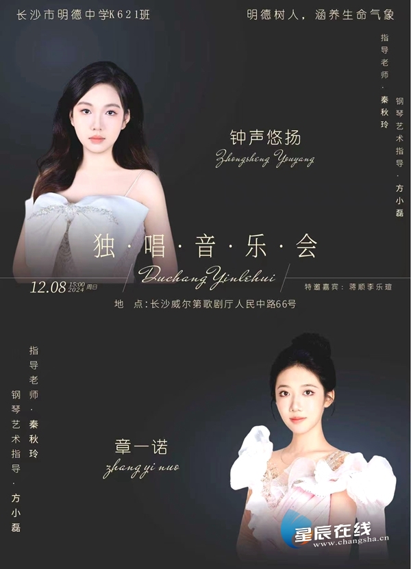 星辰在线12月10日讯(通讯员 星尘) 2024年12月8日下午,位于长沙市人民路的威尔第歌剧厅灯光璀璨,明德中学明星艺术班高二年级K621班章一诺和钟声悠扬两位同学的“一诺钟声”独唱音乐会在这里如期举行,近两百名观众欣赏到了一场精彩别致的艺术盛宴。