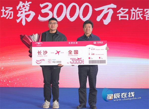 “很荣幸能成为今年长沙机场第3000万名旅客,这么多年来,长沙机场给我最深的感受是坐飞机越来越方便、智能、省心,服务也越来越温馨。祝愿长沙机场越来越好!”今年长沙机场的第3000万名幸运旅客芮海利向记者介绍,他每年需要乘坐飞机往返全国各地近20次,最初从家到登上飞机需要两个半小时,如今,时间已经缩短到一个半小时,对于像他这样有出行需求的乘客来说很便利。当天,他还被邀请上台,获得由海南航空赠送的长沙往返国内任意目的地免费机票一张。