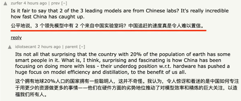 “3 个领先模型中有 2个来自中国实验室?中国追赶的速度真是令人难以置信。”在美国知名技术社区Hacker News,一位开发者如此感叹。“中国初创公司已展现出赶超美国人工智能模型的迹象,而且他们追赶的速度比许多业内人士预期的要快。”美国《华尔街日报》的12月24日的一篇报道中,也通过对比中美两国AI企业推理模型的表现和研发速度,得出上述结论。