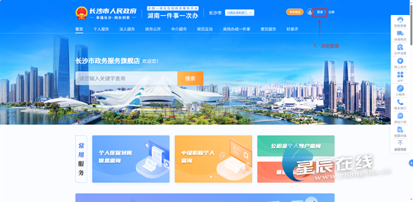 在电脑端打开浏览器,搜索“长沙市政务服务网”,打开网页,点击右上角“登录”,使用本人微信扫描小程序码完成登录。也可输入以下网址,进入长沙市政务服务网。(https://zwfw-new.hunan.gov.cn/csywtbyhsjweb/cszwdt/pages/default/index)