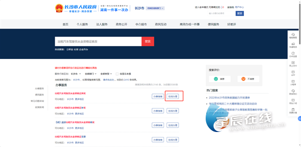 在搜索框内搜索“出租汽车驾驶员从业资格证换发”,点击“在线办理”。