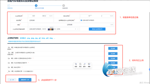 根据系统提示,上传“申请巡游出租汽车驾驶员从业资格证承诺书”“近期2寸正面免冠彩色证件照片”“机动车驾驶证及复印件”“身份证照片”“安全驾驶记录(在12123平台查询截屏)”和“《出租汽车驾驶员从业资格证补(换)发登记表》”,这里要注意,材料类型限制为上传图片格式,身份证照片正反面都要上传。点击“保存并下一步”。