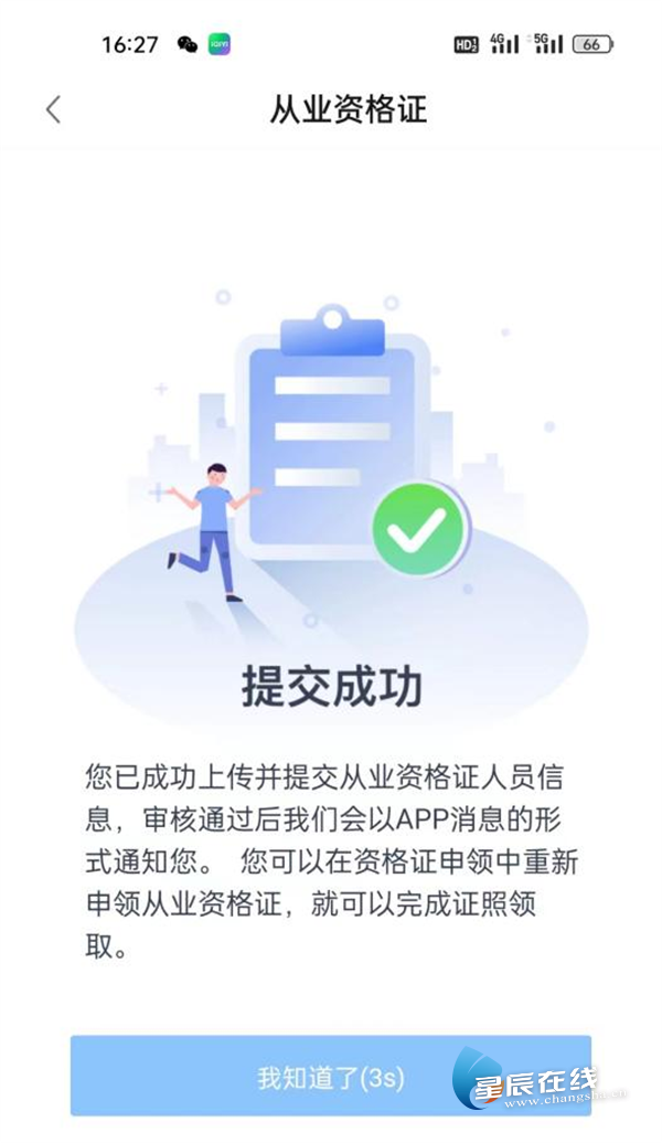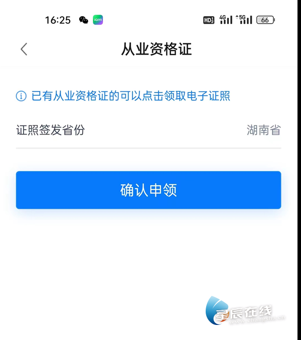 进入实名认证,上传身份证正面照片后,点击完成。证照签发省份选择湖南省,点击确认申领。