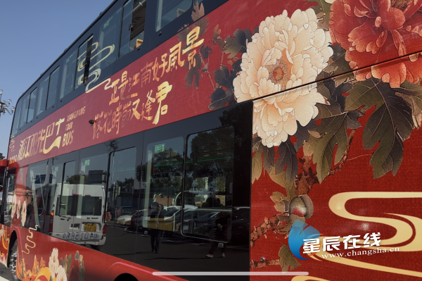 (巴士外观设计时尚,车身以红色为主,同时勾勒出杜甫江阁、太平老街、洋湖水街、贺龙体育场等景区景点。)