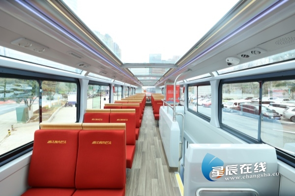 步入车内,与车身同色的布艺座椅两两相排,坐上去松软舒适,车窗宽大而质感通透,可隔座开启,视野极佳。走上二层发现,车辆顶部为全景天窗设计,市民、游客可通过这座“移动观景台”360度领略长沙城市风光。