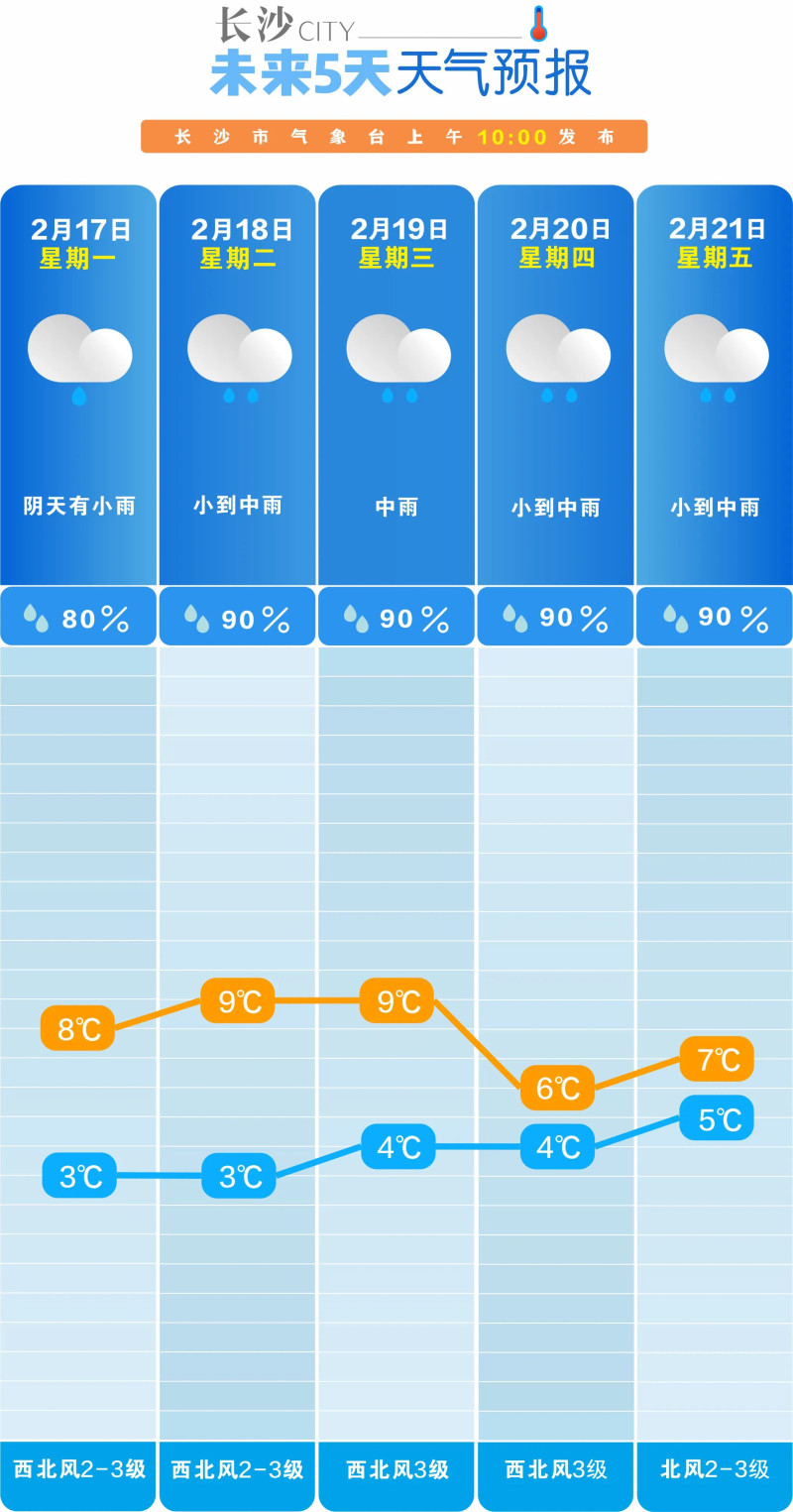 根据长沙市气象台发布的天气预报,未来一周长沙多阴雨天气,冷空气活跃。16日到19日白天,西南风逐渐加强,高空槽配合切变线影响,长沙有中雨;19日晚到23日,冷空气南下,配合高空波动影响,长沙阴雨天气持续。记者注意到,虽然进入“七九河开”的日子里,但寒意犹存,未来几日最高气温都在10℃以下。