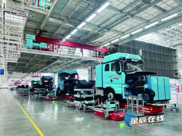 走进三一智联重卡产业园,这里已是一派赶生产忙备货的热闹景象。在三一重卡智能制造车间,200多台机器人与工人一起紧张地忙碌着,超过700台AGV(自动导引车)有序地穿梭;在发货场,等待发货的新能源重卡整齐排列,不同涂装色彩的重卡中有不少将发往海外。