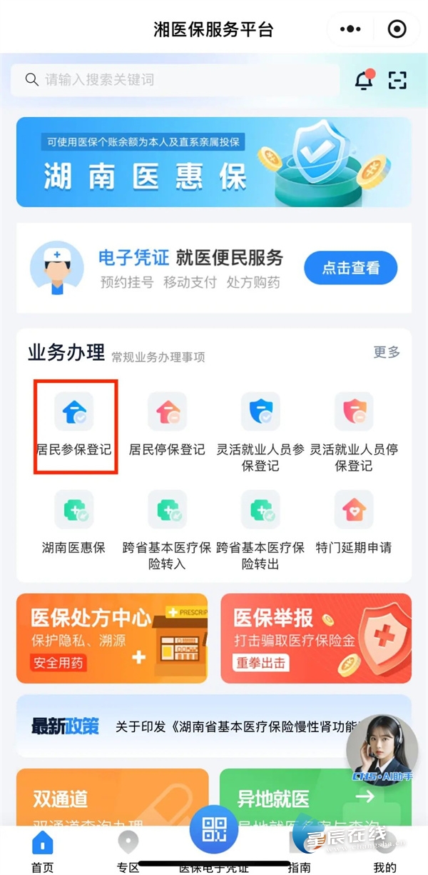 2、在“业务办理”栏目找到“居民参保登记”按步骤进行登记即可