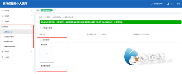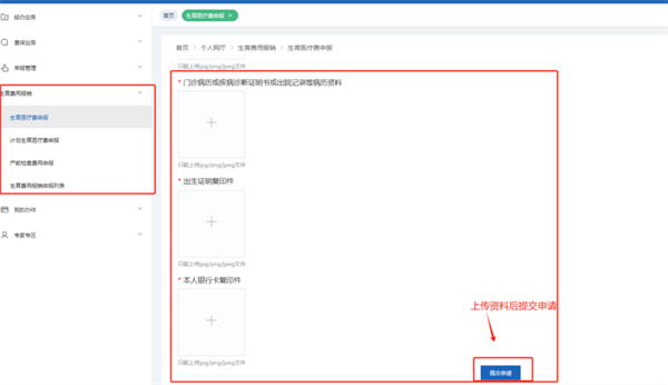 1. 登录个人网厅,在生育费用报销菜单进行附件费用上传,按材料清单上传附件信息,每一个材料均支持上传多个附件,材料上传完成后点提交申请进行上报。