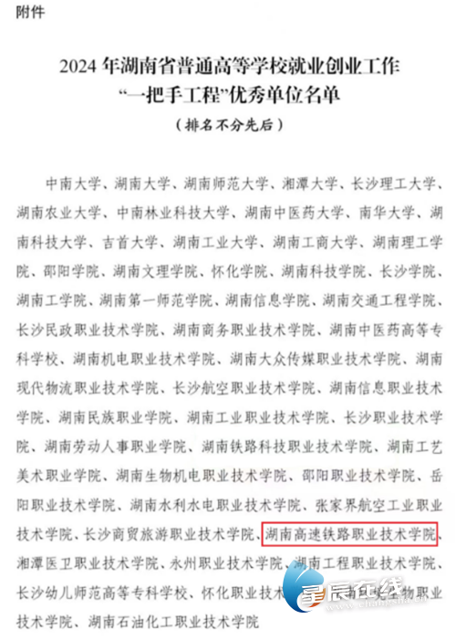 星辰在线3月5日讯(通讯员 王海军 匡华云)近日,湖南省教育厅发布《关于2024年湖南省普通高等学校就业创业工作“一把手工程”优秀单位的通报》,湖南高铁职院再次荣获优秀单位。