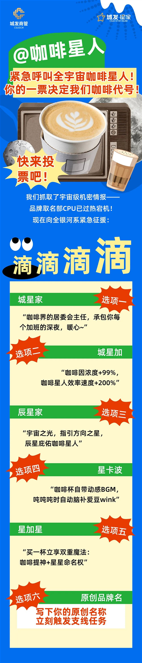 现在,我们希望听到你的声音,通过投票,选出那个最能触动你心灵的咖啡品牌名字,让它成为我们共同的热爱与记忆,让我们一起,用一杯咖啡的温度,温暖每一个平凡的日子;用一个名字的力量,凝聚我们对美好生活的向往。快来参与城发星家人才公寓原创咖啡品牌命名投票活动吧!让我们共同见证,一个属于我们的咖啡品牌诞生,开启一段新的充满热爱与美好的生活旅程。