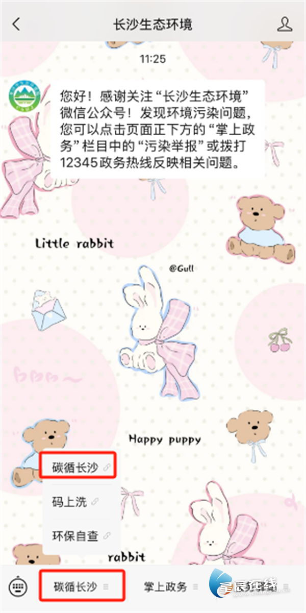 1.扫码关注“长沙生态环境”公众号,并点击菜单【碳循长沙】进入界面。