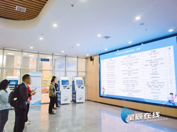 (应聘者正在仔细观看滚动的招聘岗位。以上图片均由 星辰全媒体记者 贺亚玲 摄)