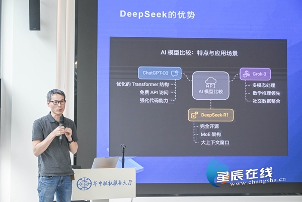 紧接着,星辰在线技术总监李正希带来《DeepSeek如何赋能工作和生活》主题培训。“AI发展为版权发展带来机遇,例如版权作品的丰富、版权作品溯源等等,AI为版权工作赋能。”李正希围绕人工智能概述、通用大模型演变、DeepSeek优势、AI推进版权工作发展、典型应用案例等多个方面,结合人工智能大模型的发展趋势和前沿技术,深入浅出地讲解了AI如何影响工作和生活,以及AI未来发展方向。