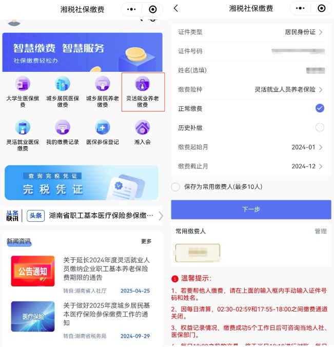 为保障灵活就业人员养老保险权益,缓解缴费压力,根据《湖南省人力资源和社会保障厅 国家税务总局湖南省税务局关于延长2024年度灵活就业人员缴纳企业职工基本养老保险费期限的通告》,我省灵活就业人员(含当年新增参保及由单位职工转为灵活就业人员参保)2024年基本养老保险费的缴费期限将延长至2025年6月30日。个人可按上年度缴费基数上下限、灵活就业人员缴费比例缴纳2024年度自愿选定月份的基本养老保险费,不加收滞纳金。