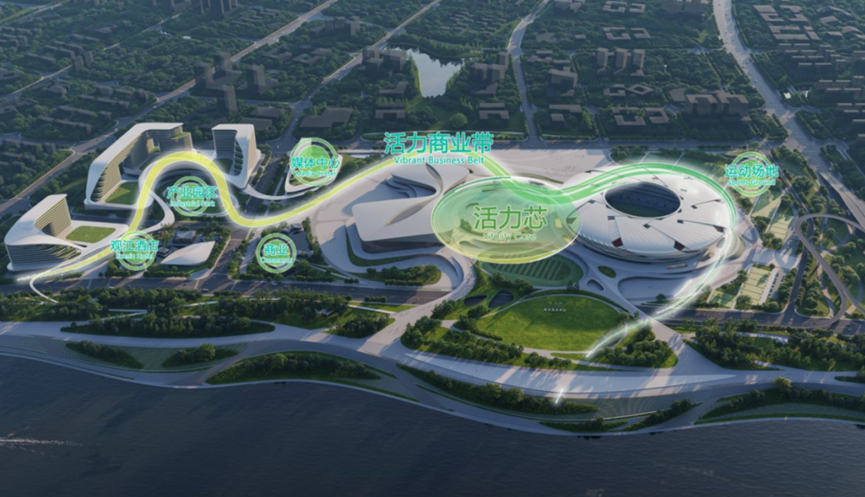 根据建筑概念方案,奥体中心将以活力生态绿芯构建与湘江科学城的跨江轴线,由正反各九片单元网壳交错叠合,与内部的红色体育场心共构体育场基本形态。生态绿芯有机串联体育场、体育馆和游泳馆,围合出7万余平方米的室外开阔空间,构建集体育赛事、文艺演出、全民健身、商业开发于一体的7×24小时全域活力秀场。