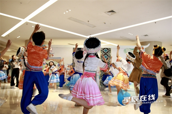 演出开始前,湖南大剧院外场已化作欢乐的海洋。长沙市芙蓉区育才第二小学和雨花区枫树山南屏锦源小学的孩子们身着民族服饰,在《竹・韵》中模拟竹林摇曳的姿态,在《团圆舞》的节奏中跳起摆手舞,孩子们手拉手围成圆圈,热情邀请观众加入舞阵。现场观众感慨:“还没进剧场,就已经被这份童真与热情感染了!”