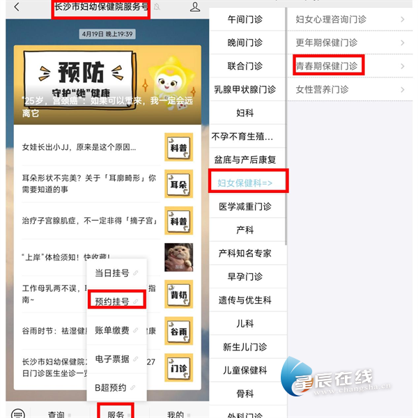 关注长沙市妇幼保健院服务号→【服务】→【预约/当日挂号】→【妇女保健科】→【青春期保健门诊】,挂号成功即可按预约时间来院就诊。