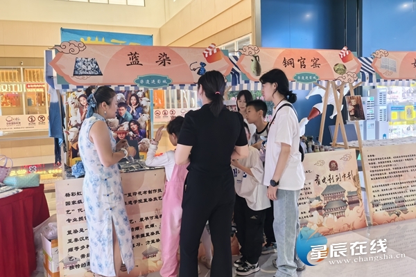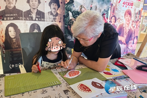 记者看到,影院设置了明油纸伞、剪纸、铜官窑、漆扇、女书和蓝染等6个非遗展区,国家级、省级、市级非遗传承人也来到了现场,向大家展示介绍。现场还专门开辟了非遗体验区,邀请市民游客亲身体验非遗魅力。“首先将纸张折叠,勾勒出线条。”活动现场,省级非遗项目“纸影技艺”第七代传人蔡絮才正手把手教小朋友剪纸技巧,一边生动地讲述剪纸的文化背景和寓意故事,激发小朋友的学习兴趣和好奇心。“很开心看到这么多小朋友都对剪纸感兴趣,跟他们互动教学的过程其实就是文化传承的过程。”蔡老师说。