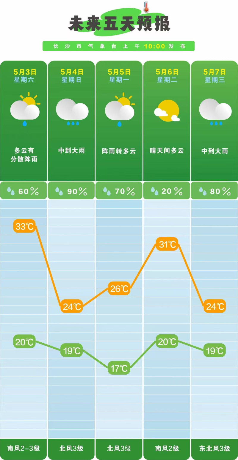 其中,5月3日长沙多云有分散阵雨,气温20℃至33℃;5月4日到5日白天,长沙有一次中到大雨、局地暴雨过程,气温下降8℃左右,局地伴有短时强降水、雷暴大风等强对流天气;5月5日晚上到6日,长沙多云到晴天;5月7日到8日,长沙又有一次较强降雨过程;5月9日,长沙多云有分散阵雨。