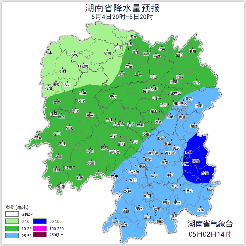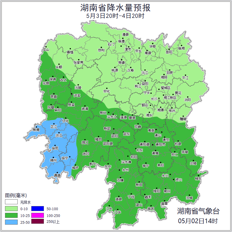 此外,省气象台预计,5月3日晚上到4日白天,湘中以南阴天有中等阵雨或雷阵雨,其中怀化南部、邵阳西部部分地区大雨,其他地区多云转小到中等阵雨或雷阵雨,雷雨时局地阵风7级;4日晚上到5日白天,湘南阴天有中到大雨,其中衡阳东部、郴州北部、株洲南部局地暴雨,其他地区小到中等阵雨或雷阵雨转多云。