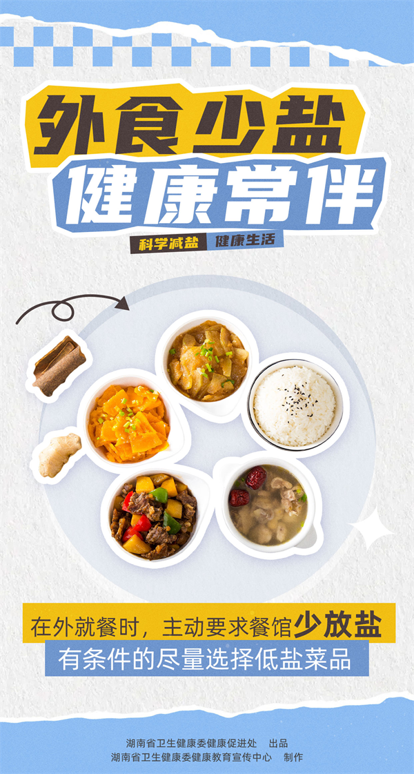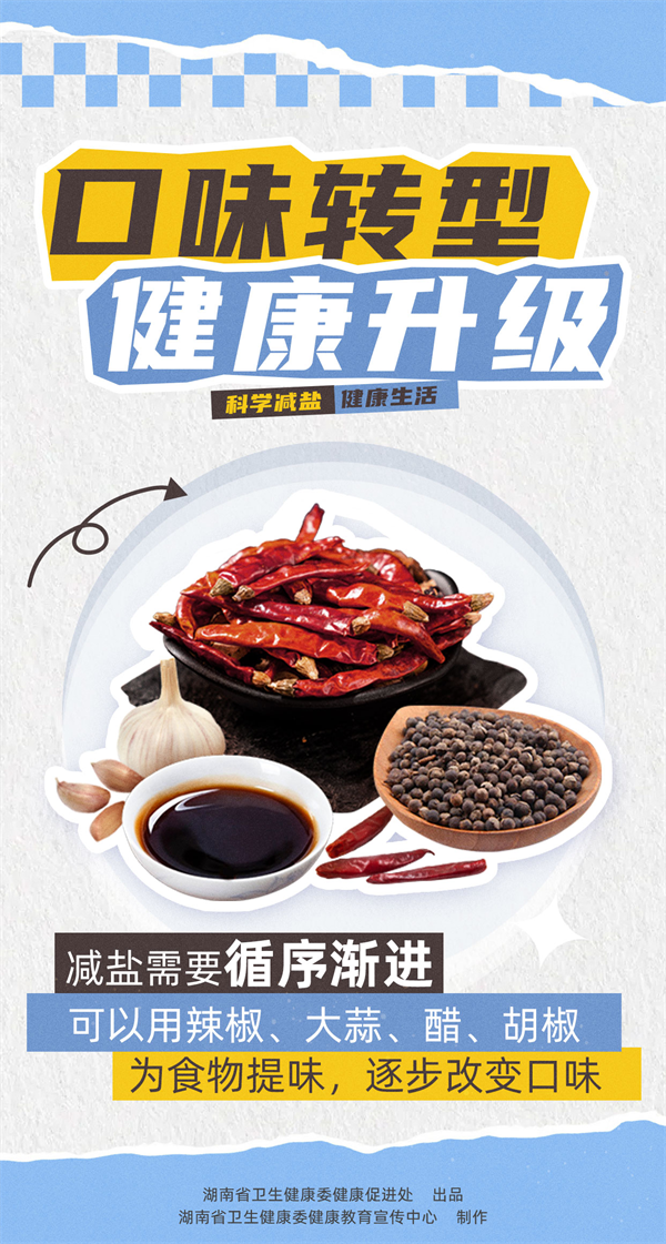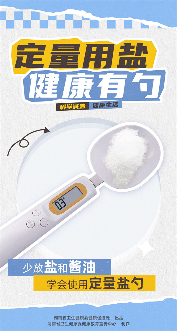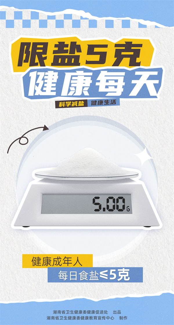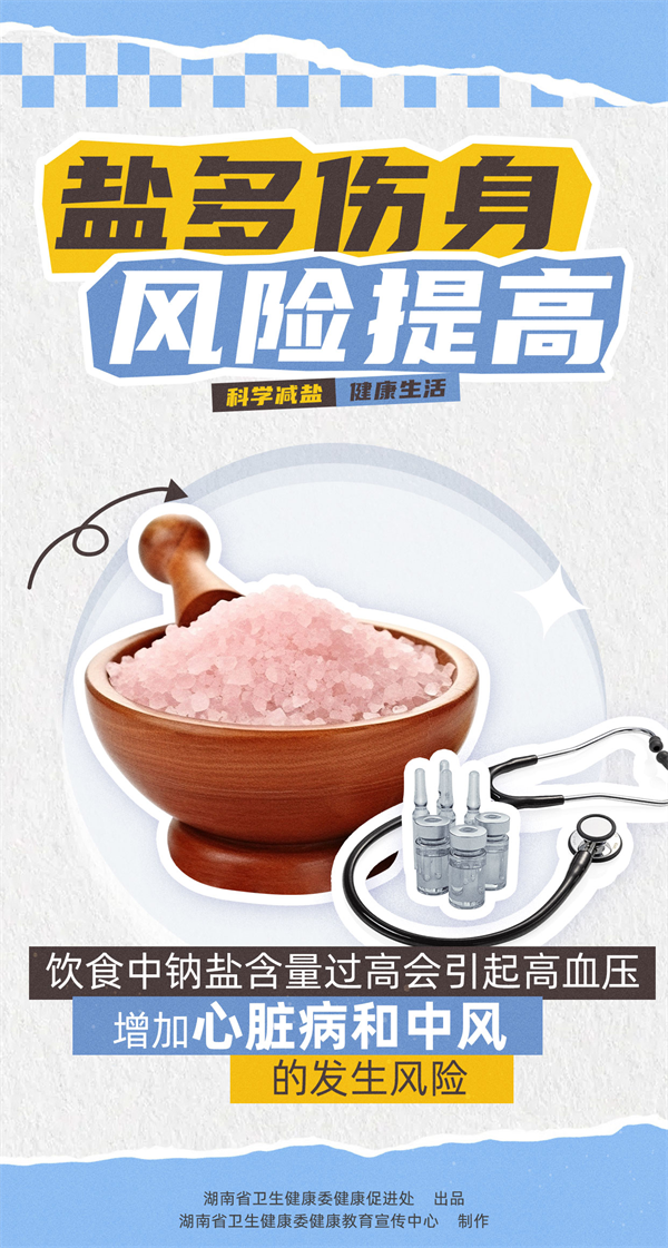 星辰在线5月6日讯(通讯员 赵涛)高盐饮食正悄无声息地危害着大众健康。相关研究数据显示,我国居民人均每日盐摄入量远超世界卫生组织推荐的5克标准,平均达到10.5克,这使得高血压、心脏病等疾病的发病风险显著增加。为提升公众健康意识,湖南省卫生健康委健康促进处、省卫健委健康教育宣传中心精心制作科学减盐宣传海报,为大众科普减盐知识。此次活动意在呼吁大家减少食盐摄取量,以科学减盐为起点,迈向健康生活新征程,让健康从“盐”开始。