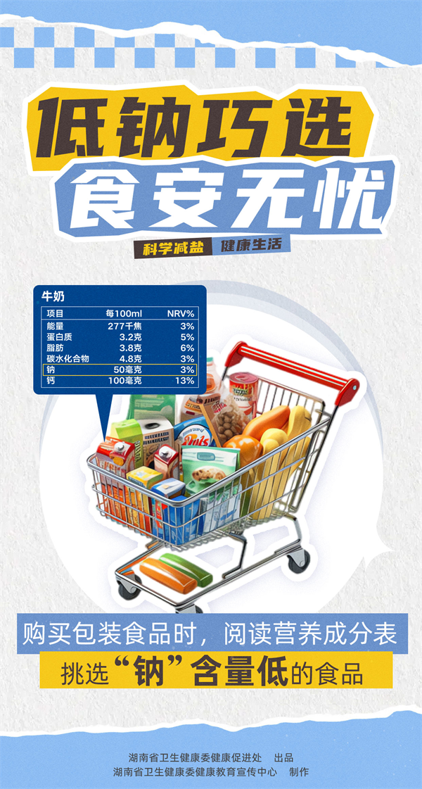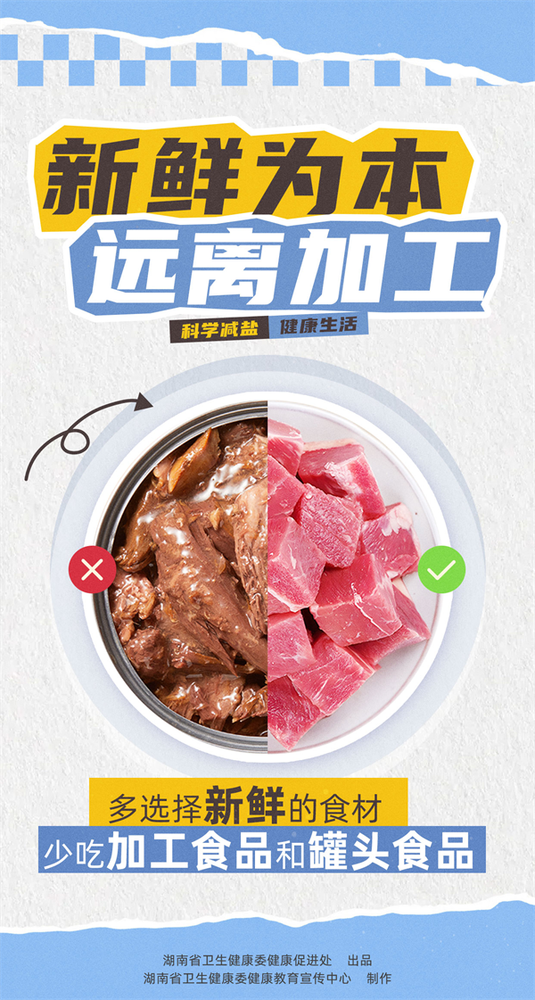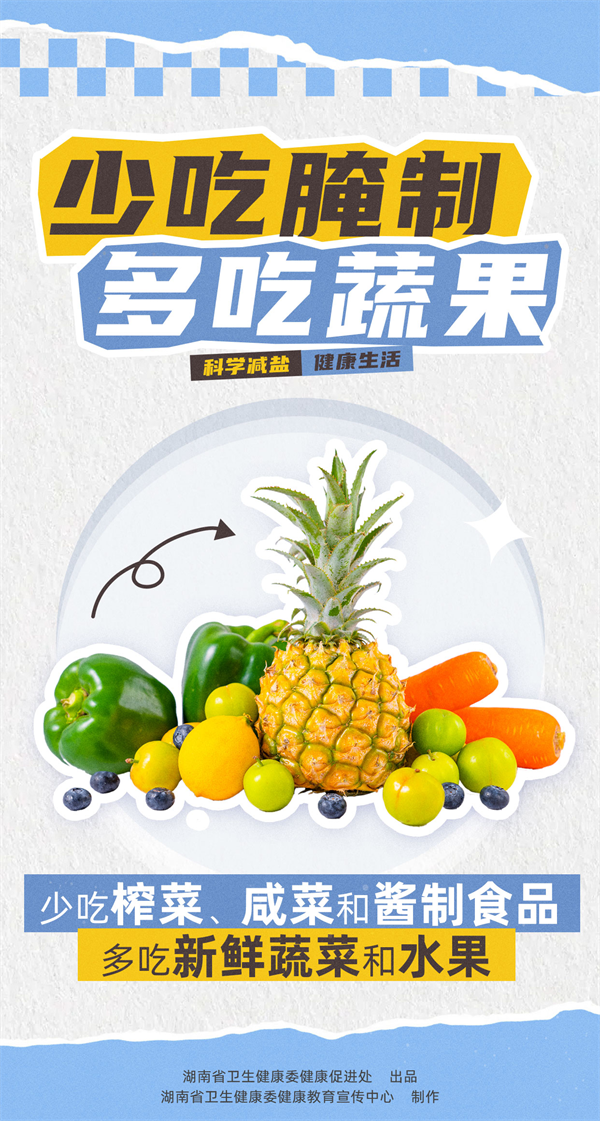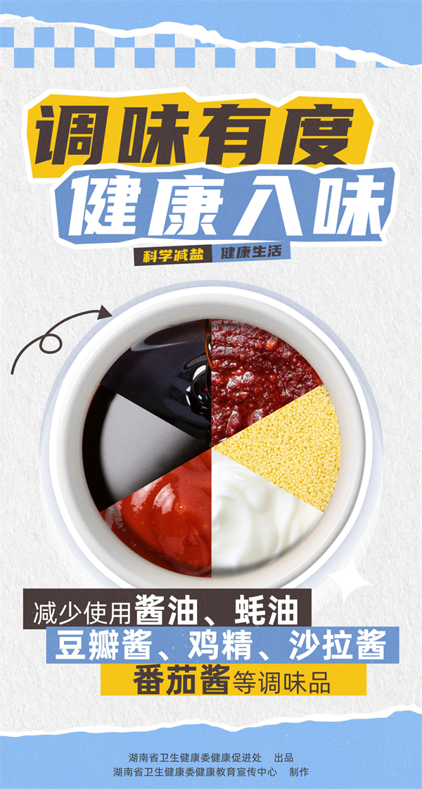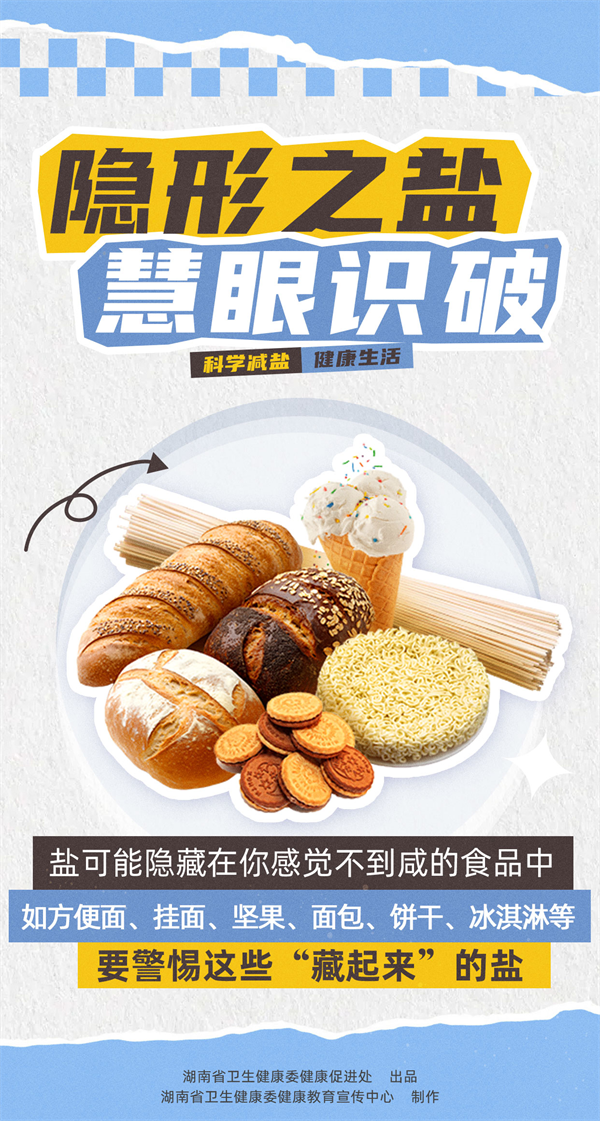 星辰在线5月6日讯(通讯员 赵涛)高盐饮食正悄无声息地危害着大众健康。相关研究数据显示,我国居民人均每日盐摄入量远超世界卫生组织推荐的5克标准,平均达到10.5克,这使得高血压、心脏病等疾病的发病风险显著增加。为提升公众健康意识,湖南省卫生健康委健康促进处、省卫健委健康教育宣传中心精心制作科学减盐宣传海报,为大众科普减盐知识。此次活动意在呼吁大家减少食盐摄取量,以科学减盐为起点,迈向健康生活新征程,让健康从“盐”开始。