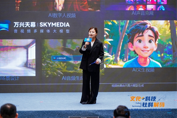 来自万兴科技的刘楚楚为大家介绍万兴科技的创新产品。万兴科技发布国内首个音视频大模型“天幕”可通过AI一键生成《岳阳楼记》等传统文化大片,赋能文旅与短视频创作。旗下“万兴喵影”“万兴播爆”等产品集成AIGC技术,实现文生视频、多语言数字人口播等功能,助力文化破圈传播。作为深耕数字创意20年的行业领军者,万兴科技以技术创新推动“文化+科技”融合,立足湖南,打造全球影响力的AI创意生态,让传统文化焕发新生。“未来,我们扎根湖南,继续用技术“放大招”,为文化+科技产业注入超强动力!为长沙打造文化和科技融合示范高地贡献“万兴”力量。”刘楚楚说。