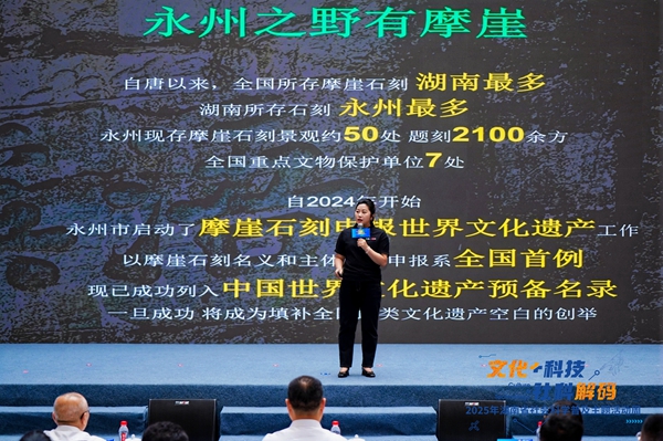 来自知了青年的张准介绍“数字浯溪”项目。该项目为面临风化威胁的永州浯溪碑林505方千年摩崖石刻打造数字化全链路解决方案,建成全球首家摩崖石刻数字博物馆。该项目让游客能沉浸式穿越时空感受唐宋至民国的碑林艺术,使石刻笔触清晰可辨、历史故事生动再现,成功将文物转化为可触摸、可体验的文化新地标,为文化遗产保护与传承开辟数字化新路径。
