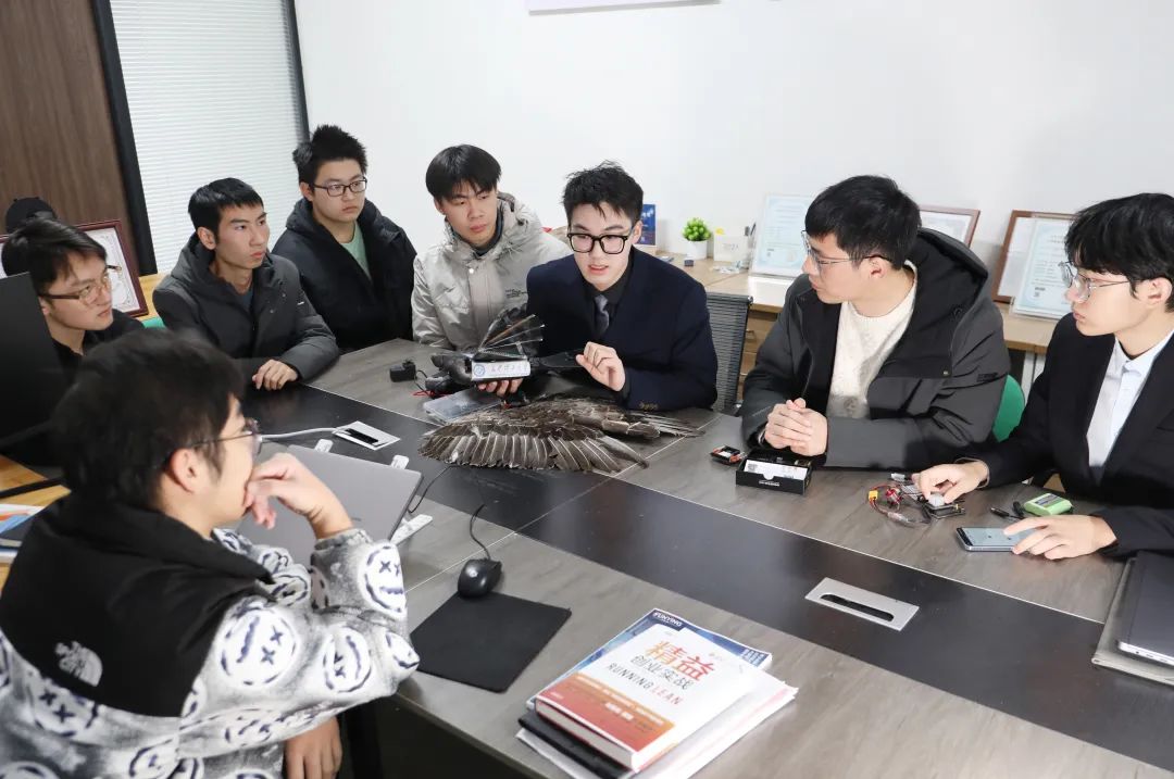 吴睿恩和团队核心成员讨论仿生扑翼机器人模型设计。