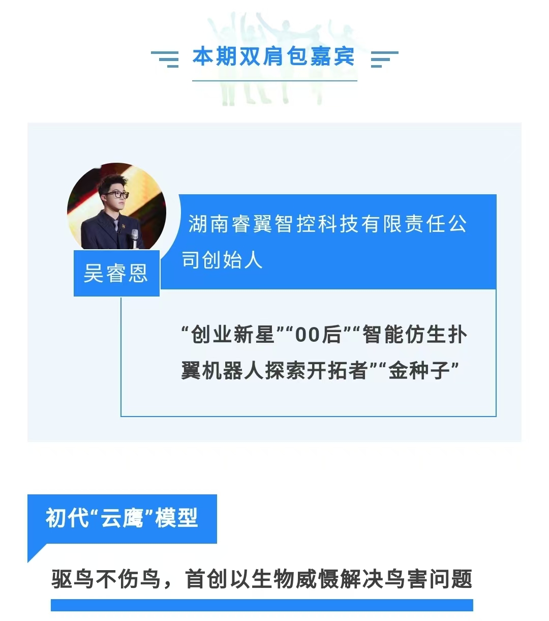 有没有一种设备,能在驱赶鸟类的同时,又不伤害鸟类呢?于是,本科一年级时,吴睿恩便萌生了创业的想法,那就是——打造全球领先的驱鸟仿生扑翼机器人。吴睿恩和团队从大自然中找到灵感,研发出的驱鸟仿生扑翼机器人能精准复现鹰类猛禽的外观,以及滑翔、俯冲、盘旋、扑食等动作,在电站和机场等区域形成高效、长时的生物威慑。