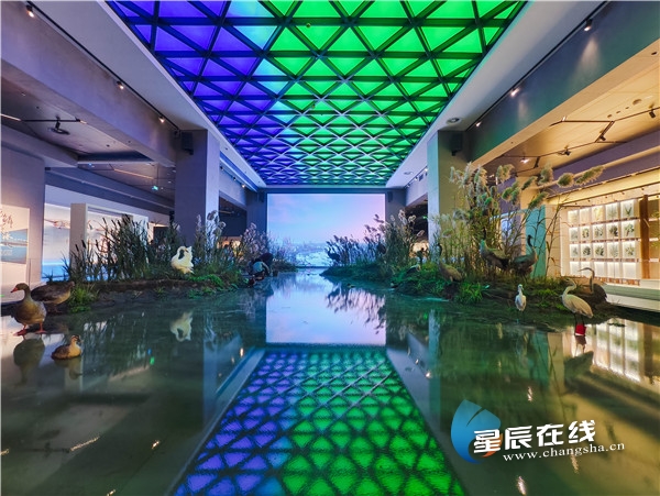洞庭湖博物馆一层南侧的自然馆是核心展区,分为 "洞庭天下水"" 衔远山吞长江 ""天然乐园" 三大主题。"洞庭天下水" 通过地质变迁模型、多媒体影片等,展现洞庭湖亿万年的形成过程;"衔远山吞长江" 以动态数据和历史影像,讲述洞庭湖水系的演变与生态价值;“天然乐园”则以巨型湿地复原景观和互动游戏,呈现洞庭湖丰富的动植物资源,包括江豚、候鸟等明星物种。馆内还设有 5D 穹幕影院《洞庭幻境》,通过沉浸式体验,生动呈现人与自然和谐共生的生态画卷。