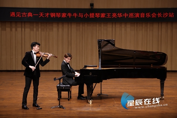 (青年钢琴家牛牛(张胜量)与小提琴家王亮联袂呈现的“遇见古典”五城巡演第二站在长沙音乐厅举行。)