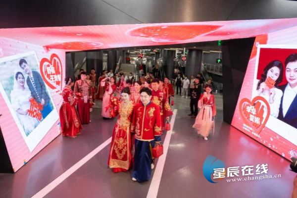 “亲爱的乘客您好,今天是520,爱的列车即将到站。下一站,开往幸福的明天。勇敢去爱,长沙地铁陪你同行。”溁湾镇站化身“接亲”站,爱的广播响彻4号线站台;轨行区灯箱展出新人照片与祝福语,营造温馨氛围;“我们结婚啦”主题打卡墙、“爱情梯牌秀场”以及“纪念车票合影点”同步开放,长沙地铁数字艺术馆打造沉浸式浪漫秀场,新人集体走秀开启专属高光亮相仪式。