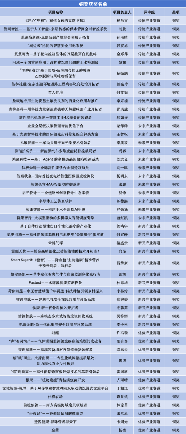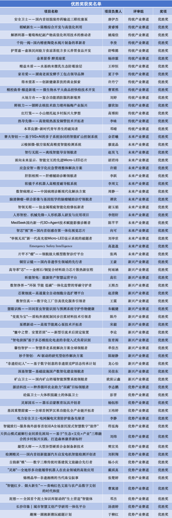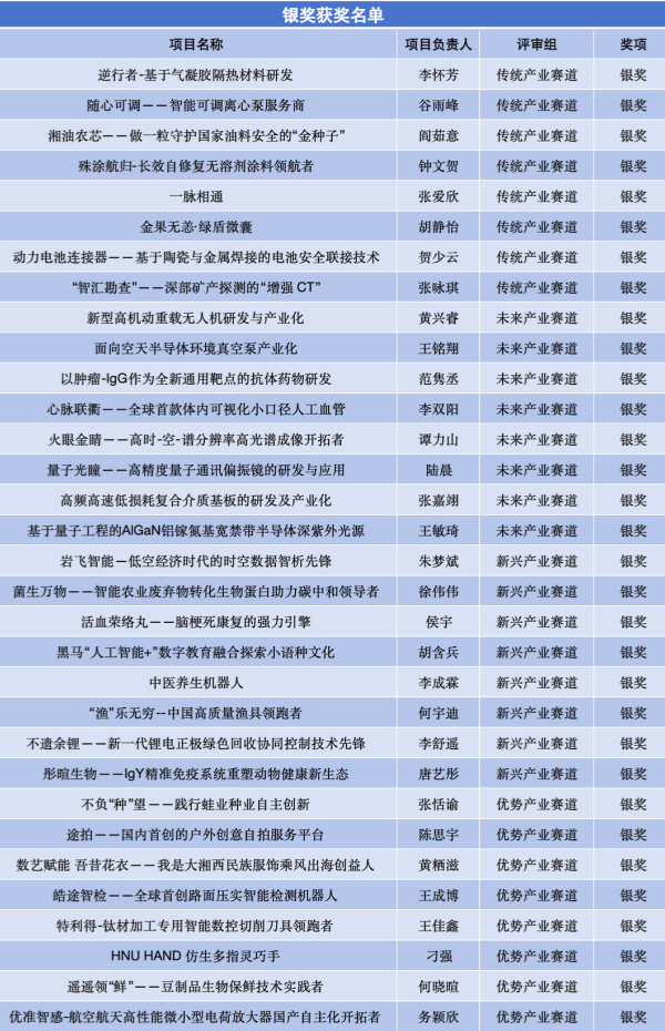活动现场颁发了优秀组织奖(20个)、特别贡献奖(5个)及金、银、铜奖(共53个项目)。在铜奖颁奖环节,组委会以“六谷”(稻、黍、稷、粱、麦、菽)为礼,寓意创业需扎根现实、凝聚团队、勇担使命。颁奖词中“向下扎根,向上生长”“以创新之姿创造时代价值”等表述,诠释了大赛对创业精神的深层期许。金奖项目代表在领奖后表示,将以湖南为创业起点,推动科技成果转化,助力乡村振兴与产业升级。