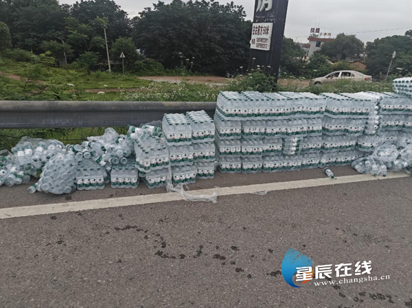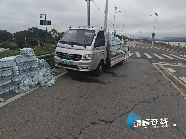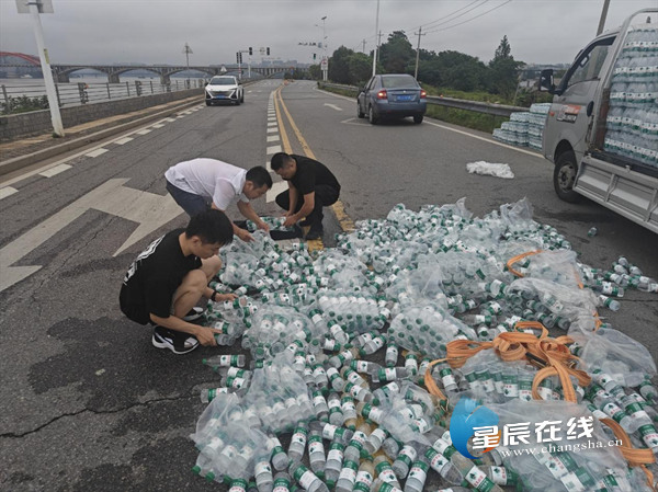 (天心特巡警大队民警赵义、姚凯帮司机拾起散落的矿泉水。)