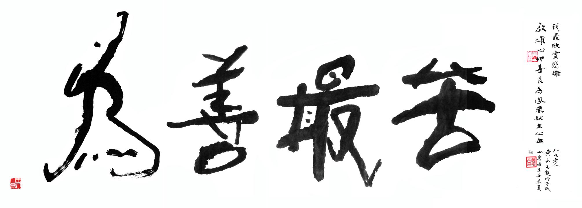 忘年情深,心神相通,二十多年知遇之恩,亦想到当时他提写“为善最苦”的笑言:“启雄啊,小的不够苦,得写大的!”墨迹里藏着他一生的诙谐与通透。这四字何尝不是他与凤凰的注脚?少时离乡漂泊,晚年以笔为刀,他的苦是赤子的天真,是“不折不从”的倔强,更是对这片土地近乎偏执的深情。