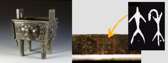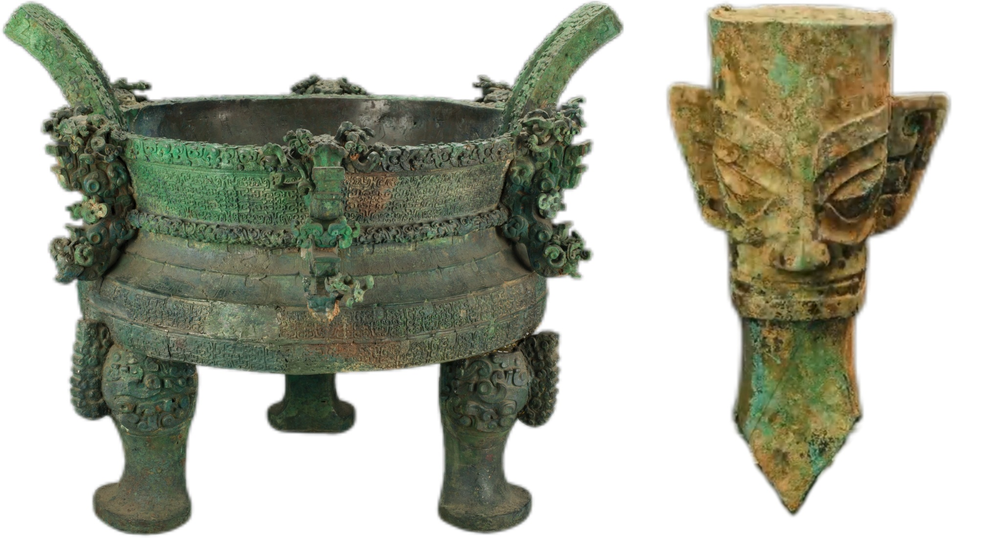 △展出文物:左为春秋·“王子午”铜鼎,右为商·青铜人头像。