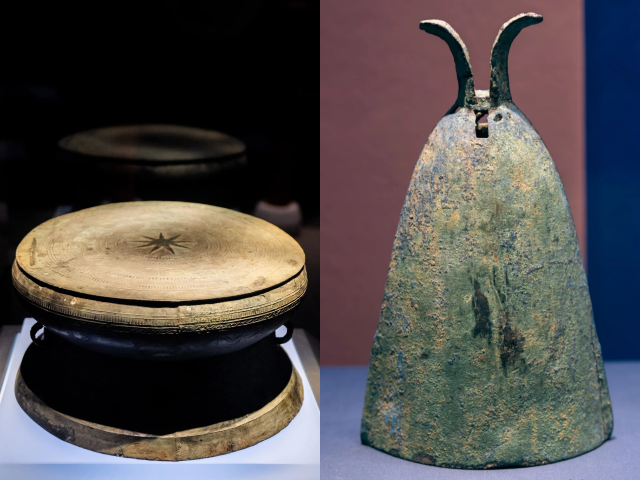 △展出文物:左为西汉·石寨山型铜鼓,右为战国至西汉·羊角钮钟。