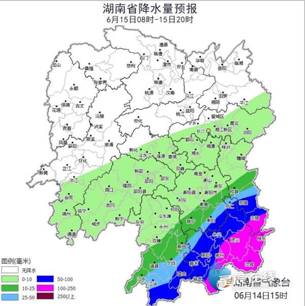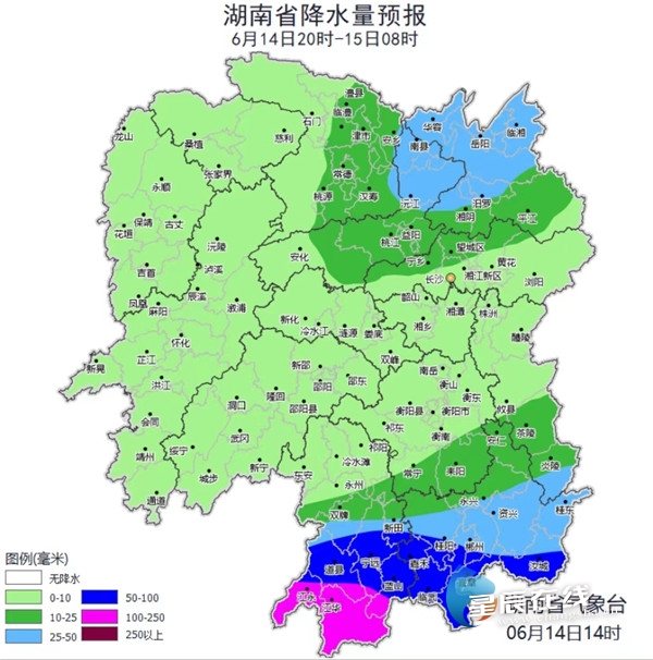 湖南省气象台预计,6月14日夜间,湘南、湘东北会有中到大雨,其中永州南部、郴州南部部分地区下暴雨,永州(江华、江永、道县、蓝山、宁远)有大暴雨,阵风8到10级;15日白天,湘南有中到大雨,其中永州南部、郴州、株洲南部、衡阳南部下暴雨,郴州(市区、宜章、资兴、桂东、汝城)、株洲(炎陵)有大暴雨,阵风8到10级。长沙市气象台预计,14日晚上到15日白天,全市大部地区下中雨,宁乡东北部、望城北部、长沙县北部、浏阳东南部下大雨,北风3到4级、阵风6到8级,气温在22℃至29℃之间,15日小雨转多云,23℃至 30℃;15日晚上到17日,槽后偏北气流控制,以晴天或多云天气为主,最高气温会升至 35℃;18日,副高摆动,有阵雨或雷阵雨;19日到20日多云为主;21日,会有一次强降雨过程。